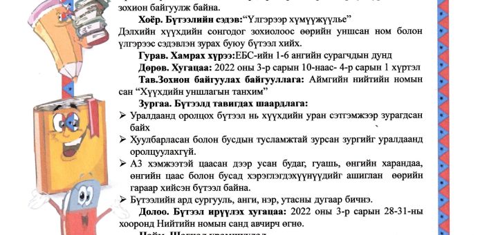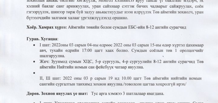 Аймгийн ЗДТГазрын Нийгмийн Бодлогын Хэлтэс, “Ном түгээе” төсөлтэй хамтран Аймгийн сумдын Соёлын төвийн номын санч, төвийн МСҮТөв, ЕБС-ийн номын санч нарт чиглэл өгөх сургалт хэлэлцүүлэг зохион байгууллаа. Сургалтаар НБХ-ийн дарга Д. Мөнхцэцэг, НБХ-ийн ахлах...
